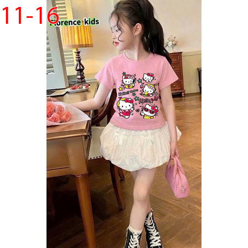 A509315 - Set váy dập ly ren cực xinh cho bé áo thun cotton 4c in Kitty chân váy bí kèm chip trong_S