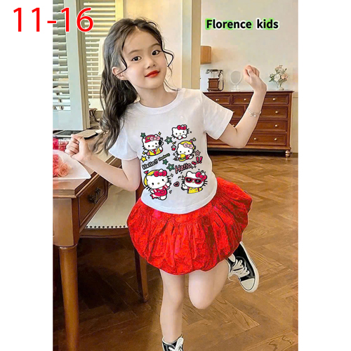 A509318 - Set váy dập ly ren cực xinh cho bé áo thun cotton 4c in Kitty chân váy bí kèm chip trong_S