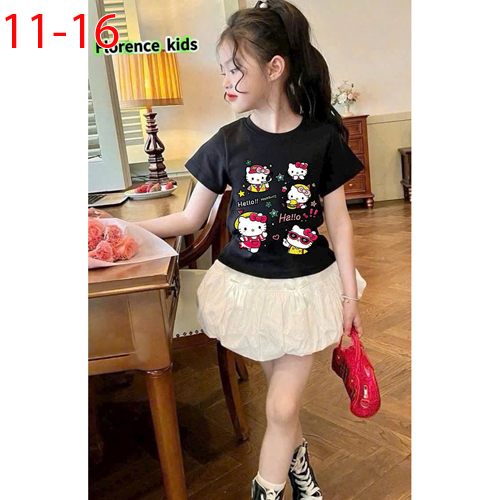 A509319 - Set váy dập ly ren cực xinh cho bé áo thun cotton 4c in Kitty chân váy bí kèm chip trong_S
