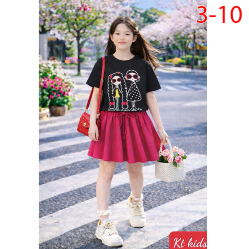 A509384 - Sét váy xinh cho bé yêu thun cotton 4c in chữ in cô bé chân váy xếp ly nhẹ nhàng_Size 3-10