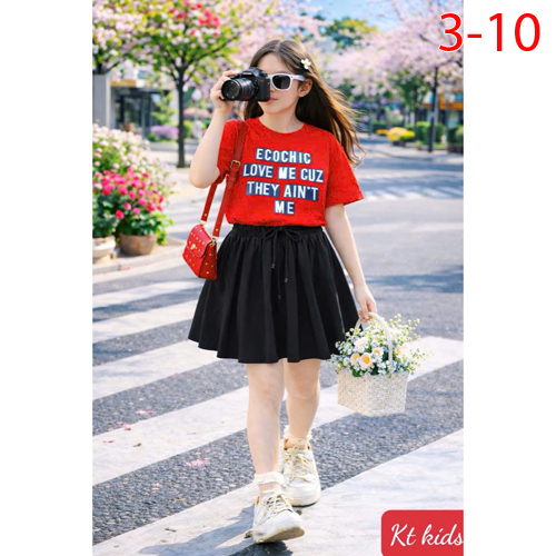 A509391 - Sét váy xinh cho bé yêu thun cotton 4c in chữ in cô bé chân váy xếp ly nhẹ nhàng_Size 3-10