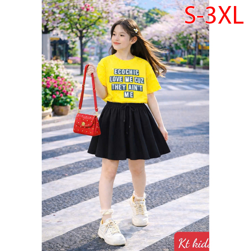 A509415 - Sét váy xinh cho bé yêu thun cotton 4c in chữ in cô bé chân váy xếp ly nhẹ nhàng_Size S-3X