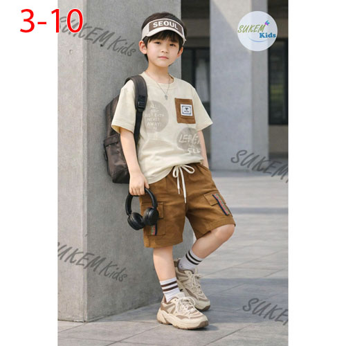 A509539 - Bộ bé trai thun cotton áo may ngắn tay in phun cham phối đắp túi thể thao quần cắt rã phối