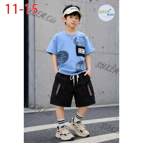 A509543 - Bộ bé trai thun cotton áo may ngắn tay in phun cham phối đắp túi thể thao quần cắt rã phối