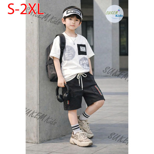 A509549 - Bộ bé trai thun cotton áo may ngắn tay in phun cham phối đắp túi thể thao quần cắt rã phối