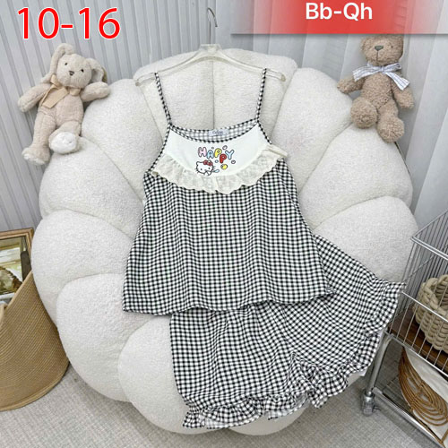 A509587 - (1/5)Bộ bé gái vải caro coton mềm mại áo 2 dây có tăng đơ tăng giảm in Kitty_Size 10-16