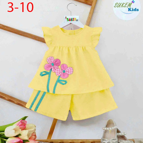 A509649 - (27/4)Set bé gái áo may tay cánh tiên nhún bèo đính Hoa quần short siêu cute vải đũi thái