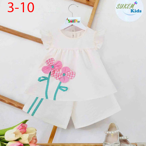 A509650 - (27/4)Set bé gái áo may tay cánh tiên nhún bèo đính Hoa quần short siêu cute vải đũi thái