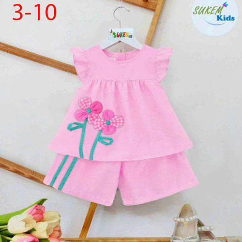 A509651 - (27/4)Set bé gái áo may tay cánh tiên nhún bèo đính Hoa quần short siêu cute vải đũi thái