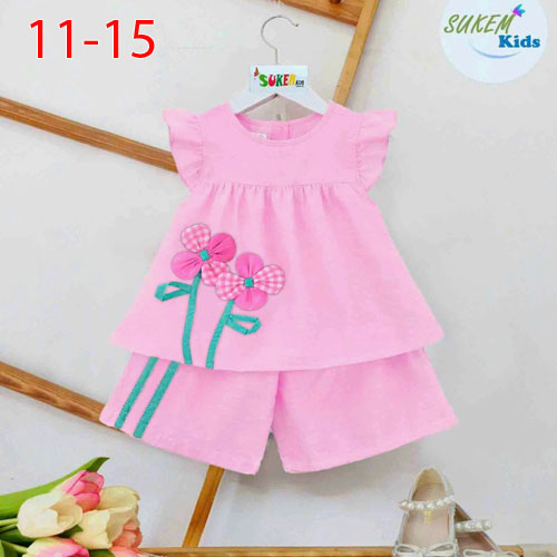 A509656 - (27/4)Set bé gái áo may tay cánh tiên nhún bèo đính Hoa quần short siêu cute vải đũi thái