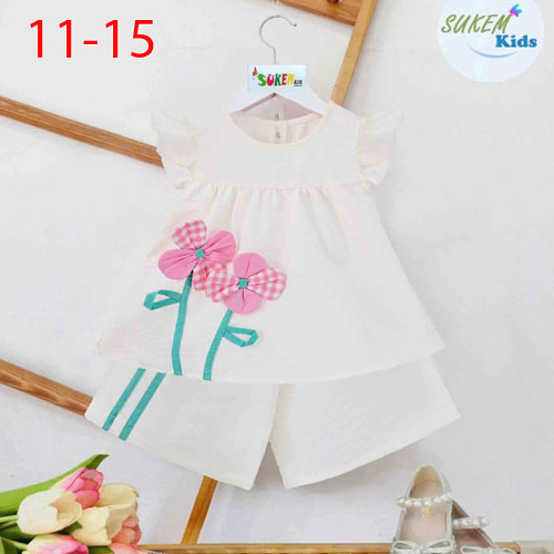 A509657 - (27/4)Set bé gái áo may tay cánh tiên nhún bèo đính Hoa quần short siêu cute vải đũi thái