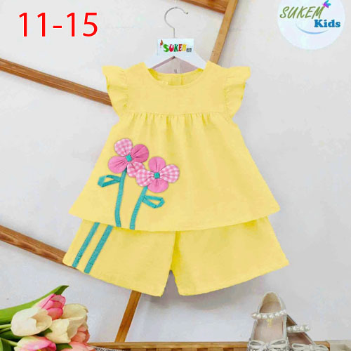 A509658 - (27/4)Set bé gái áo may tay cánh tiên nhún bèo đính Hoa quần short siêu cute vải đũi thái