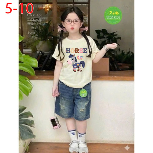 A509927 - Set jean bé gái áo thun contton in con ngựa mix cùng quần jean suông lửng_Size 5-10