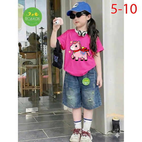 A509930 - Set jean bé gái áo thun contton in con ngựa mix cùng quần jean suông lửng_Size 5-10
