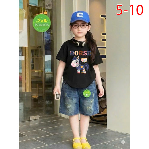 A509933 - Set jean bé gái áo thun contton in con ngựa mix cùng quần jean suông lửng_Size 5-10