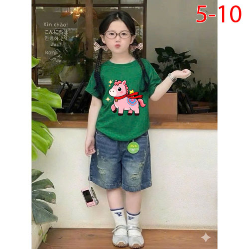A509940 - Set jean bé gái áo thun contton in con ngựa mix cùng quần jean suông lửng_Size 5-10