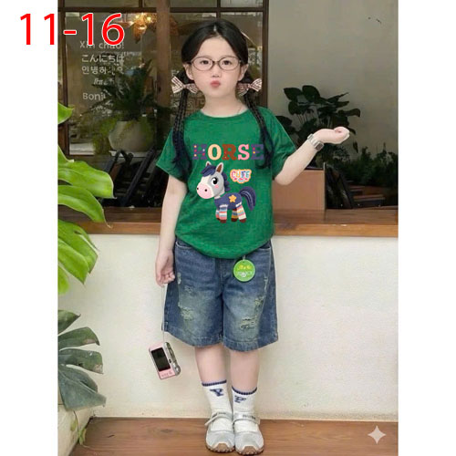 A509948 - Set jean bé gái áo thun contton in con ngựa mix cùng quần jean suông lửng_Size 11-16