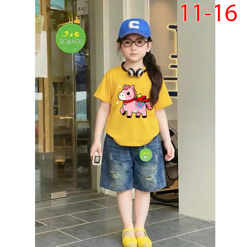 A509953 - Set jean bé gái áo thun contton in con ngựa mix cùng quần jean suông lửng_Size 11-16