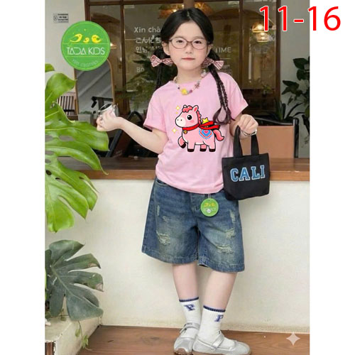 A509955 - Set jean bé gái áo thun contton in con ngựa mix cùng quần jean suông lửng_Size 11-16