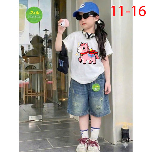 A509961 - Set jean bé gái áo thun contton in con ngựa mix cùng quần jean suông lửng_Size 11-16