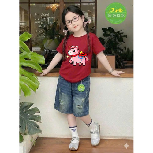 A509967 - Set jean bé gái áo thun contton in con ngựa mix cùng quần jean suông lửng_Size 17-22
