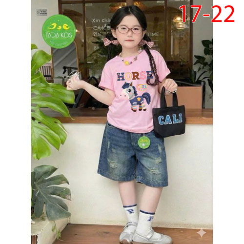 A509969 - Set jean bé gái áo thun contton in con ngựa mix cùng quần jean suông lửng_Size 17-22