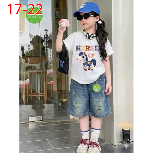 A509976 - Set jean bé gái áo thun contton in con ngựa mix cùng quần jean suông lửng_Size 17-22