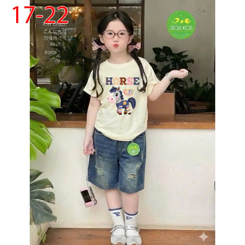 A509978 - Set jean bé gái áo thun contton in con ngựa mix cùng quần jean suông lửng_Size 17-22