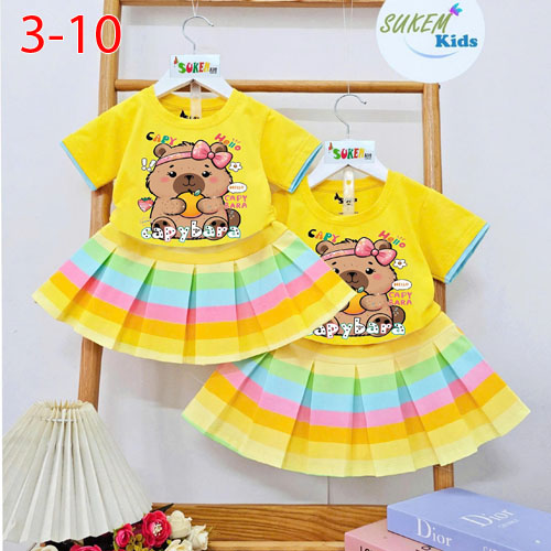 A509984 - Set váy áo thun ép hình siêu cute viền lé sọc cầu vồng chân váy xếp ly sọc cầu vồng_Size 3