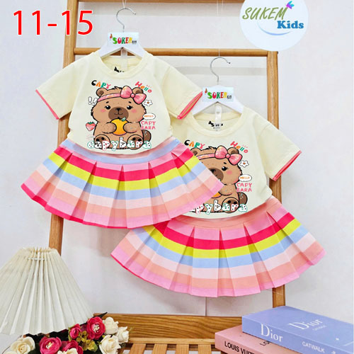 A509991 - Set váy áo thun ép hình siêu cute viền lé sọc cầu vồng chân váy xếp ly sọc cầu vồng_Size 1