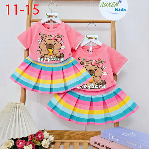 A509992 - Set váy áo thun ép hình siêu cute viền lé sọc cầu vồng chân váy xếp ly sọc cầu vồng_Size 1