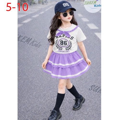 A510041 - (2/5)Set váy áo thun ngắn tay in thể thao cổ nhún bèo đính nơ in số 86 chân váy may 2 tầng