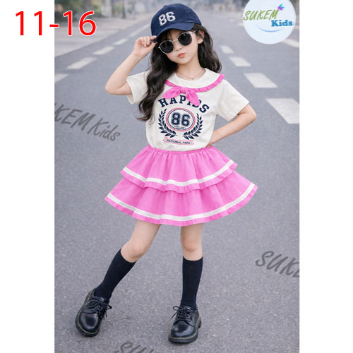 A510045 - (2/5)Set váy áo thun ngắn tay in thể thao cổ nhún bèo đính nơ in số 86 chân váy may 2 tầng