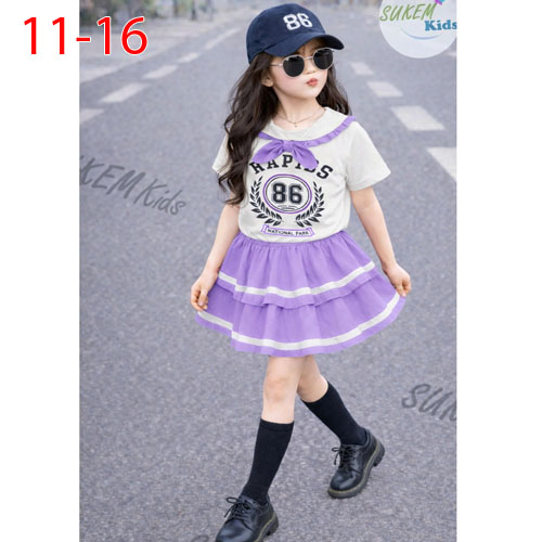 A510046 - (2/5)Set váy áo thun ngắn tay in thể thao cổ nhún bèo đính nơ in số 86 chân váy may 2 tầng