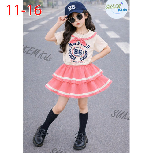 A510049 - (2/5)Set váy áo thun ngắn tay in thể thao cổ nhún bèo đính nơ in số 86 chân váy may 2 tầng