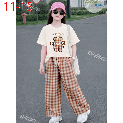 A510241 - (28/4)Set bé gái áo may ngắn tay hình thêu đắp gấu dễ thương với quần dài suông karo coton