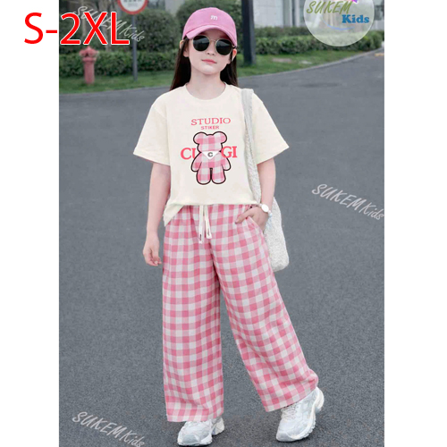 A510246 - (28/4)Set bé gái áo may ngắn tay hình thêu đắp gấu dễ thương với quần dài suông karo coton