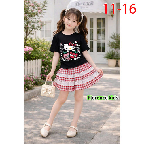 A510253 - Set váy caro 2 tầng phối ren áo rút thun eo chất thun cotton 4c in Kitty chân váy kate car