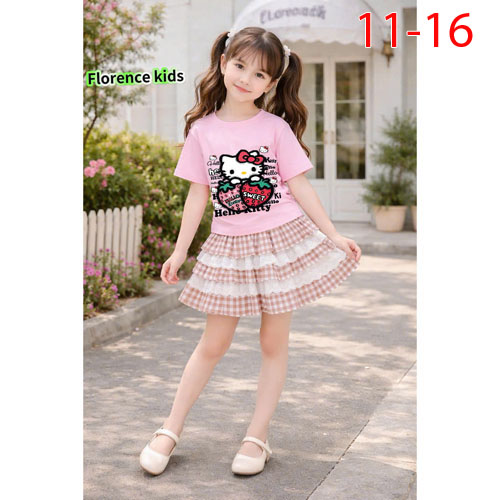 A510254 - Set váy caro 2 tầng phối ren áo rút thun eo chất thun cotton 4c in Kitty chân váy kate car