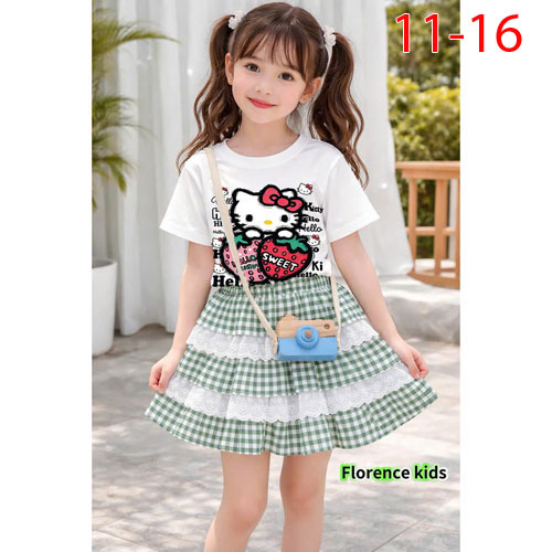 A510255 - Set váy caro 2 tầng phối ren áo rút thun eo chất thun cotton 4c in Kitty chân váy kate car