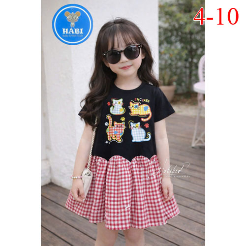 A510373 - Đầm thun bé gái đáng iu cho các nàng bánh bèo thun cotton 4c thân dưới sọc carô_Size 4-10