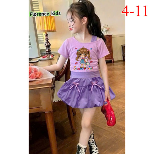 A510397 - Set váy dập ly ren cực xinh cho bé áo chất thun coton 4c in cô bé chân váy bí kèm chip tro