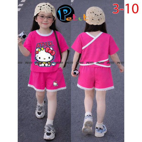 A510411 - Set bé gái áo croptop phối quần đùi áo dây chéo phía sau in Kitty in cô bé quần đùi phối v