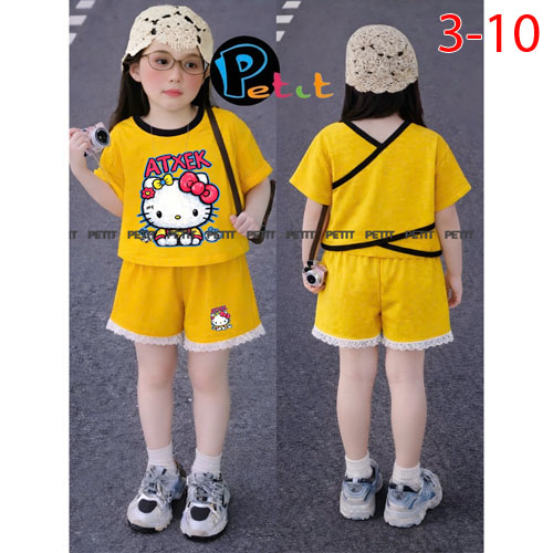 A510414 - Set bé gái áo croptop phối quần đùi áo dây chéo phía sau in Kitty in cô bé quần đùi phối v