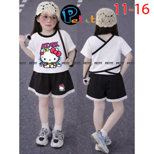 A510427 - Set bé gái áo croptop phối quần đùi áo dây chéo phía sau in Kitty in cô bé quần đùi phối v