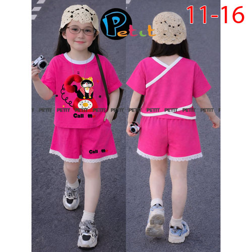 A510430 - Set bé gái áo croptop phối quần đùi áo dây chéo phía sau in Kitty in cô bé quần đùi phối v
