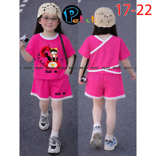 A510442 - Set bé gái áo croptop phối quần đùi áo dây chéo phía sau in Kitty in cô bé quần đùi phối v