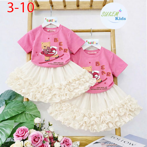 A510522 - (26/4)Set váy áo may ngắn tay ép gấu đính nơ nổi với chân váy woan thái nhún bèo 3 tầng_Si