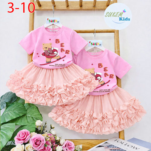 A510525 - (26/4)Set váy áo may ngắn tay ép gấu đính nơ nổi với chân váy woan thái nhún bèo 3 tầng_Si
