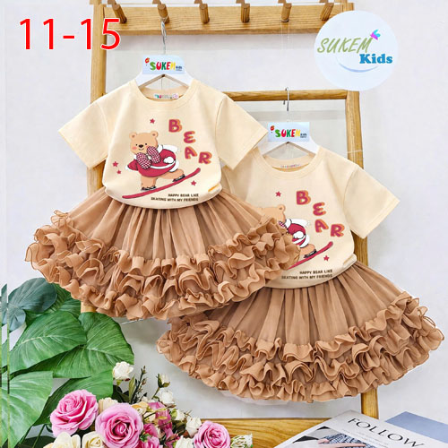 A510530 - (26/4)Set váy áo may ngắn tay ép gấu đính nơ nổi với chân váy woan thái nhún bèo 3 tầng_Si